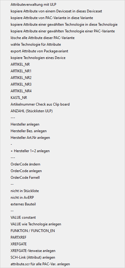 Textbutton-Menu enthält. Bei jedem Wechsel zwischen LBR- SYM- PAC- und DEV-Editor bedeutet das, dass ein Editorfenster neu geöffnet und wie oben beschrieben die eagle.scr ausgeführt wird. Gelegentlich kann es vorkommen, dass das Textbutton-Menu nicht zum Editorfenter passt. Hier läuft dann bei der Ausführung des SCRIPT etwas schief. Wann und warum konnte ich bis jetzt nicht eruieren. Sollte es mal der Fall sein, dass das Textbutton-Menu nicht zum geöffneten Editorfenster passt, dann einfach diesen Button anklicken und das Textbutton-Menu wird aktuallisiert. Das klappt immer, weil einfach die eagle.scr aufgerufen wird. ;-)