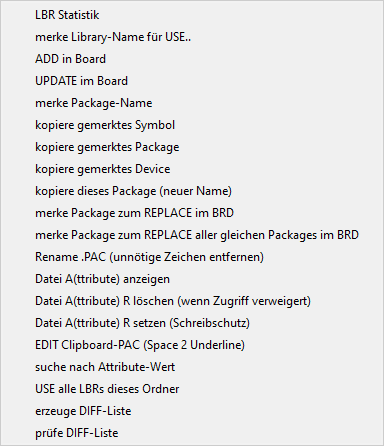 Textbutton-Menu enthält. Bei jedem Wechsel zwischen LBR- SYM- PAC- und DEV-Editor bedeutet das, dass ein Editorfenster neu geöffnet und wie oben beschrieben die eagle.scr ausgeführt wird. Gelegentlich kann es vorkommen, dass das Textbutton-Menu nicht zum Editorfenter passt. Hier läuft dann bei der Ausführung des SCRIPT etwas schief. Wann und warum konnte ich bis jetzt nicht eruieren. Sollte es mal der Fall sein, dass das Textbutton-Menu nicht zum geöffneten Editorfenster passt, dann einfach diesen Button anklicken und das Textbutton-Menu wird aktuallisiert. Das klappt immer, weil einfach die eagle.scr aufgerufen wird. ;-)