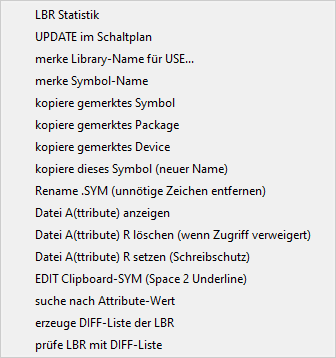 Textbutton-Menu enthält. Bei jedem Wechsel zwischen LBR- SYM- PAC- und DEV-Editor bedeutet das, dass ein Editorfenster neu geöffnet und wie oben beschrieben die eagle.scr ausgeführt wird. Gelegentlich kann es vorkommen, dass das Textbutton-Menu nicht zum Editorfenter passt. Hier läuft dann bei der Ausführung des SCRIPT etwas schief. Wann und warum konnte ich bis jetzt nicht eruieren. Sollte es mal der Fall sein, dass das Textbutton-Menu nicht zum geöffneten Editorfenster passt, dann einfach diesen Button anklicken und das Textbutton-Menu wird aktuallisiert. Das klappt immer, weil einfach die eagle.scr aufgerufen wird. ;-)