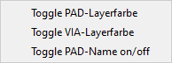 gleichen Farbe wie der Layer oder in einer anderen Farbe angezeigt werden. Wenn Screen-Shots des Layout für die Erstellung einer Dokumentation benötigt werden, sollten PADs und VIAs die gleiche Farbe erhalten wie der Kupfer-Layer. Zum Layouten ist es von Vorteil wenn PAD und VIA eine eigene Farbe besitzen. Ebenfalls ist es Sinnvoll die PAD-Namen Ein oder AUS zuschalten.
